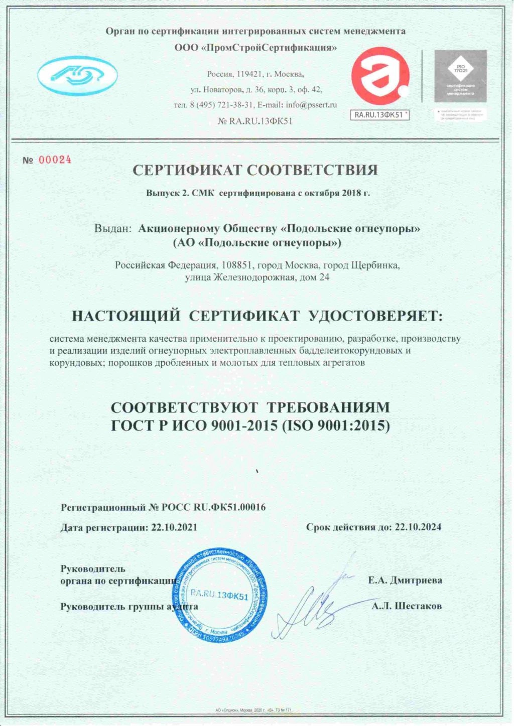 Сертификат соответствия требованиям ГОСТ Р ИСО 9001-2015 (ISO 9001:2015) системы менеджмента качества к проектированию, разработке, производству и реализации изделий огнеупорных электроплавленных бадделеитокорундовых и корундовых; порошков дробленных и молотых для тепловых агрегатов. |